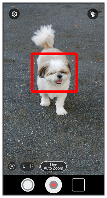 をタップすると、写真を撮ることができます。 - 被写体がLive Auto Zoom撮影画面の中央から多少ずれた場合、白いフォーカス枠がズームした状態で被写体を撮影画面の中央にとらえ直します。