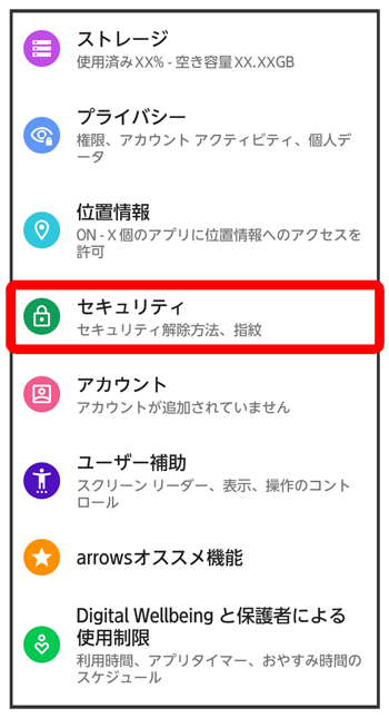 - セキュリティ解除方法の設定について詳しくは、「パターンを指でなぞって画面ロックを解除するように設定する」、「暗証番号で画面ロックを解除するように設定する」、「パスワードで画面ロックを解除するように設定する」を参照してください。