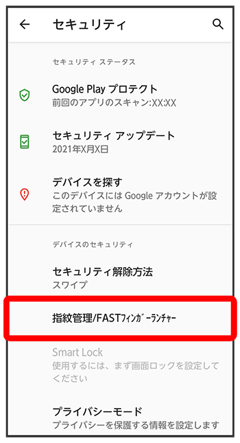 指紋管理/FASTフィンガーランチャー画面が表示されます。
