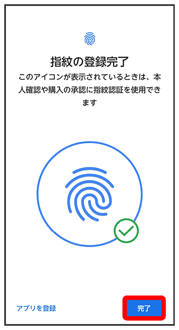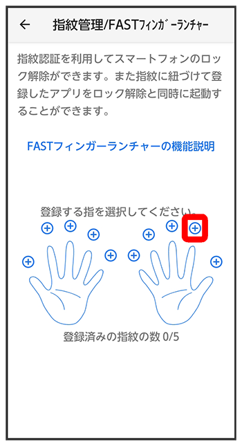 指紋管理/FASTフィンガーランチャー画面で、指紋を登録済みの指の