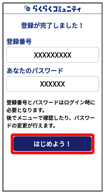 - 登録番号とパスワードをすでにお持ちのときは、をタップしてください。以降は、画面の指示に従って操作してください。