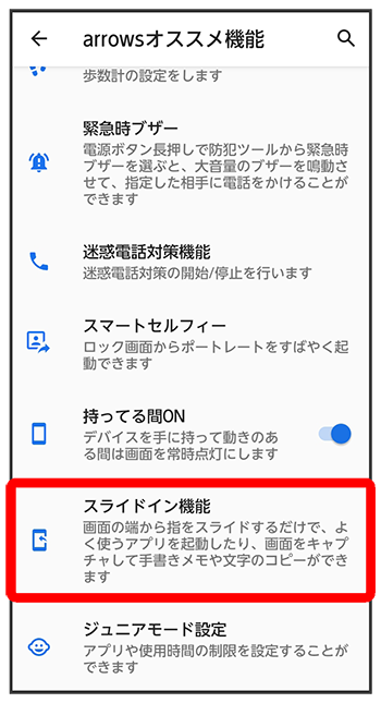 スライドイン機能画面が表示されます。