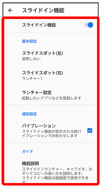 | ランチャー設定1 | 画面の端にあるスライドスポットを左にドラッグしたときに表示されるランチャーについて設定できます。 ランチャーに登録したアプリが更新された場合、登録が解除されることがあります。 |
