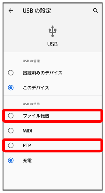 | PTP | 本機のデータをパソコンとやりとりすることができます。パソコンがMTPに対応していない場合、このモードを利用してください(PTPモード)。 |
