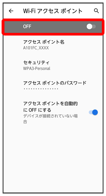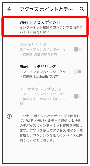 アクセスポイントとテザリング画面でアクセスポイント名を入力セキュリティタイプをタップパスワードを入力