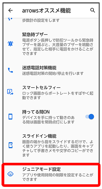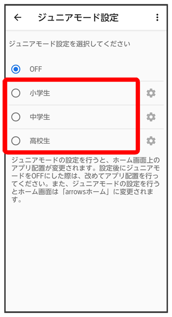 設定後にジュニアモードをOFFにしたときは、改めてアプリの配置を行ってください。 - ジュニアモード設定中に、すべてのデータを消去(出荷時リセット)を行うと、本機が初期化されて、ジュニアモードが解除されます。