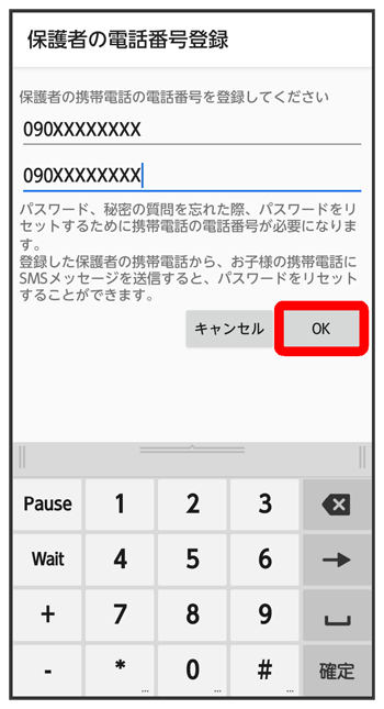 電話番号入力欄をタップ保護者の電話番号を入力電話番号(再入力)欄をタップ保護者の電話番号を再度入力