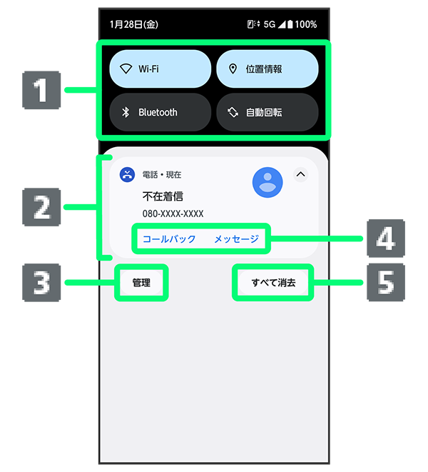 - 通知によって利用できる機能は異なります。たとえば着信の通知では、着信のあった電話番号に発信したり、SMSを送信できます。