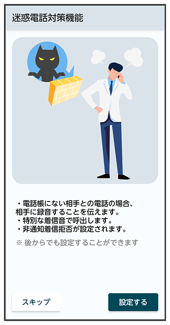 - 迷惑電話対策機能を設定しないときは、をタップします。
