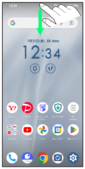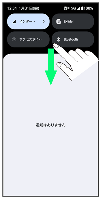 - 通知パネルが開いてない状態で、ステータスバーを2本指で下にフリックしても、クイック設定パネルを表示できます。