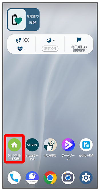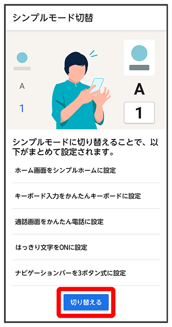 シンプルで見やすいホーム画面と読みやすい文字に切り替えます。