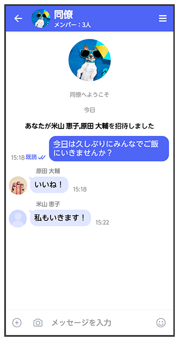 同じグループのメンバーに写真やスタンプなどが共有できます。