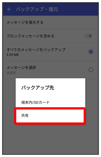 表示)にしてください。 - をタップしたときは、バックアップしたいメッセージを選択をタップしてください。