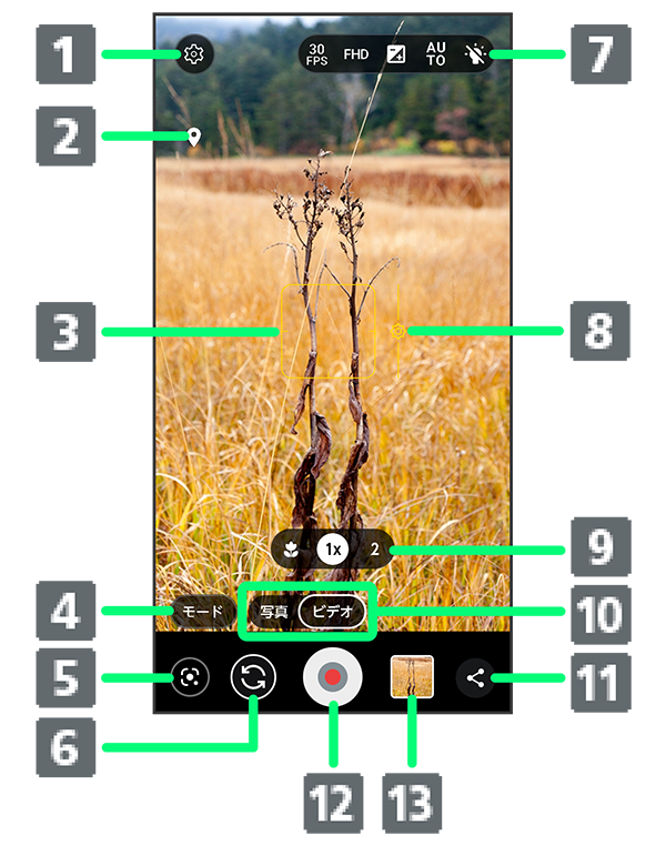 - タップしてズーム倍率を変更します。ロングタッチするとスライドバーが表示されます。スライドバーを左右にドラッグすると、ズーム倍率を調節できます。