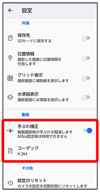 | 手ぶれ補正 | 動画撮影時の手ぶれを軽減させるかどうかを設定します。 |