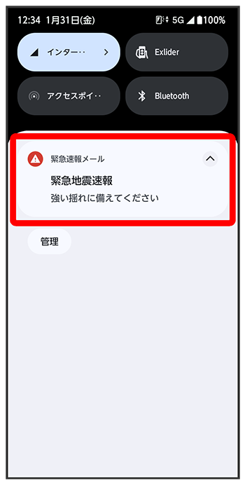 とメッセージが表示され、緊急地震速報/災害・避難情報個別の警告音およびバイブレータでお知らせします。