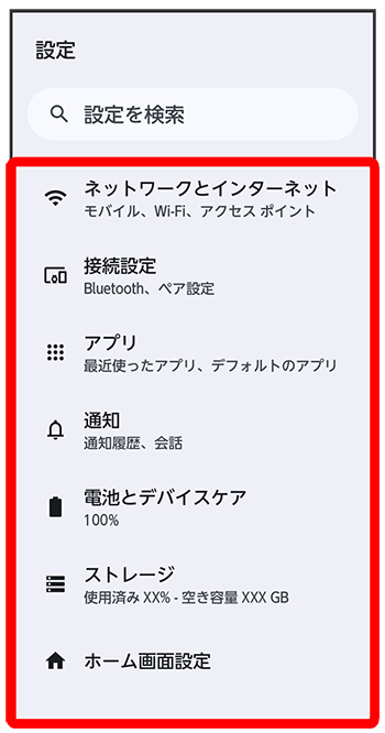 - 画面上部の検索バーをタップすると、設定メニュー内の項目を検索できます。