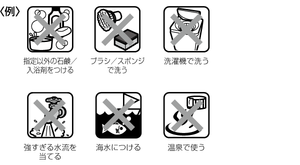 - 指定以外の石鹸、入浴剤、シャンプー、リンス、洗顔剤、メイク落とし、歯磨き粉などで洗わないでください。付着した場合はすぐに水で洗い流してください。指定品について詳しくは、「洗いかたについて」を参照してください。