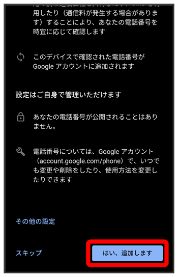 - セキュリティ保護目的でのみ電話番号を追加するときは、をタップします。以降は、画面の指示に従って操作してください。