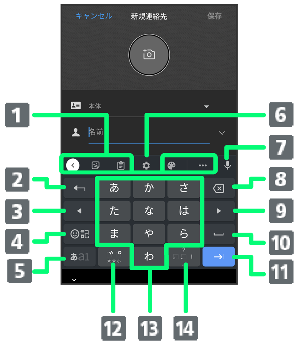 - スペース入力、または文字の変換を行います。キーボードを複数使用している場合は、ロングタッチで使用したいキーボードを選択できます。