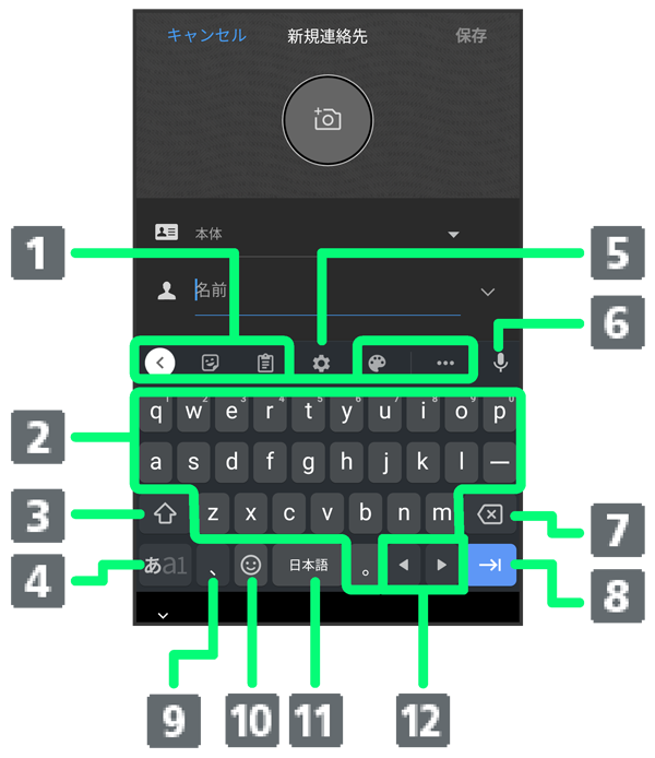 - 絵文字/ステッカー/顔文字のリストを表示します。文字入力中は?を入力します。4