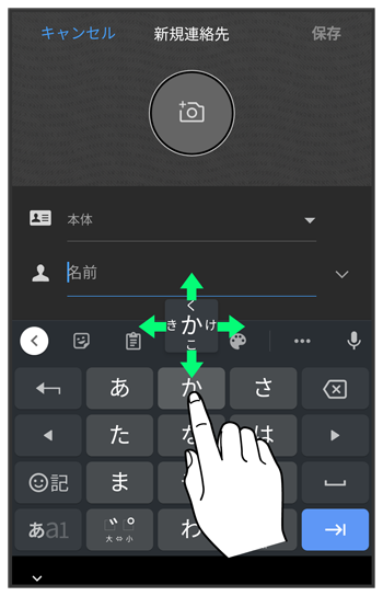12キーで入力するとき、キーを上下左右にフリックすることで、キーを繰り返しタップすることなく、入力したい文字を入力できます。キーに触れると、フリック入力で入力できる候補が表示されます。入力したい文字が表示されている方向にフリックすると、文字が入力されます。