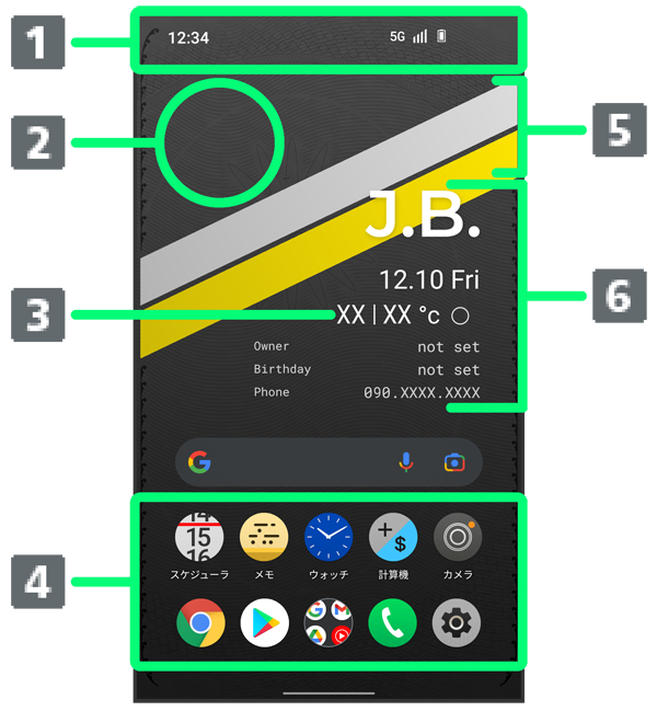 | パーソナルストライプ | 上部のストライプは左下、下部のストライプは右上にフリックすると、アプリや機能を起動できます。2色のストライプにそれぞれアプリのショートカットを設定できます。1 |