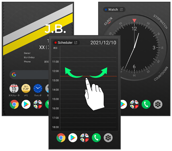 | ユーザーエリア | アプリのアイコンやフォルダ、ウィジェットを自由に配置できます。 配置したいアイコンやウィジェットをユーザーエリアの右端までドラッグすることで、ユーザーエリアシートを追加することもできます。また、配置しているアイコンやウィジェットをシートから削除すると、ユーザーエリアも削除されます。 |
