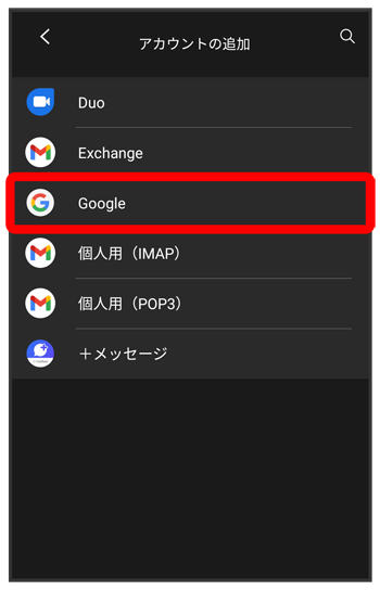 ここでは Google のメールアカウント追加を例に説明しています。