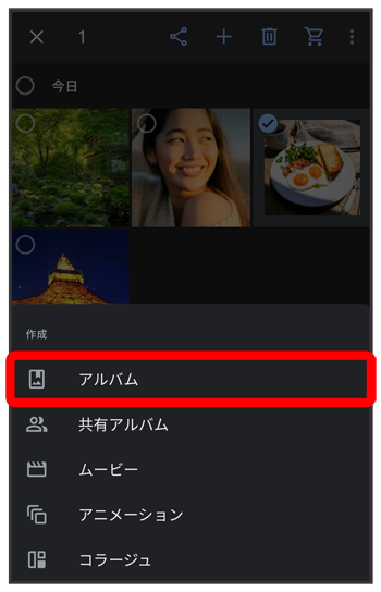 写真/動画一覧画面で写真/動画を追加したいアルバムをタップ追加したい写真/動画をタップ(- 写真/動画をタップするたびに、選択(