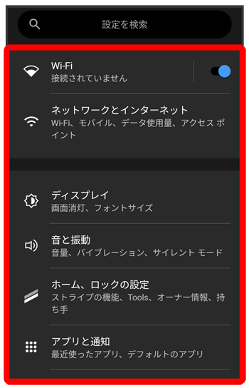 | ネットワークとインターネット | Wi-Fiやモバイル ネットワーク、データ使用量など、ネットワークやインターネットに関する設定ができます。 |