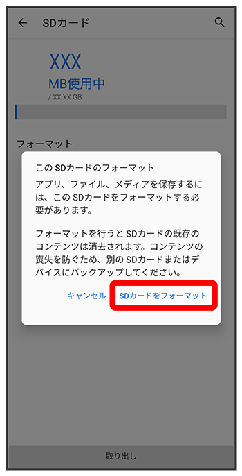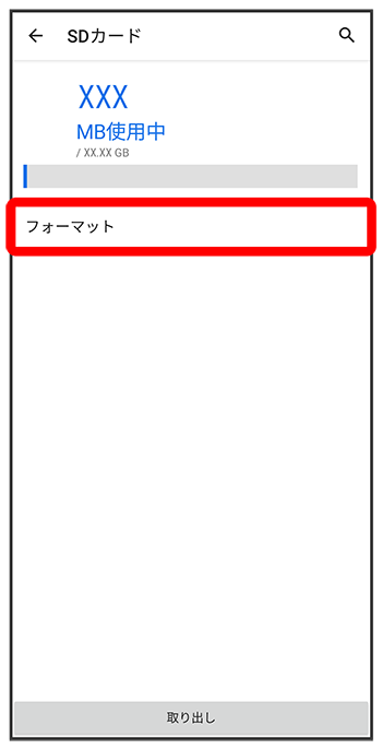 - フォーマットすると、SDカード内のデータがすべて消去されます。ほかの機器で使用したSDカードをフォーマットするときは、あらかじめよくご確認のうえ、操作してください。