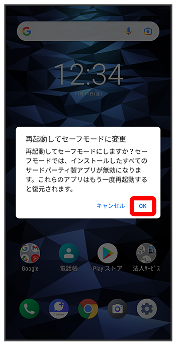- セーフモードで電源を入れると、画面左下に「セーフモード」と表示されます