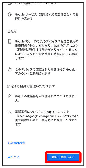 - セキュリティ保護目的でのみ電話番号を追加するときは、をタップします。以降は、画面の指示に従って操作してください。