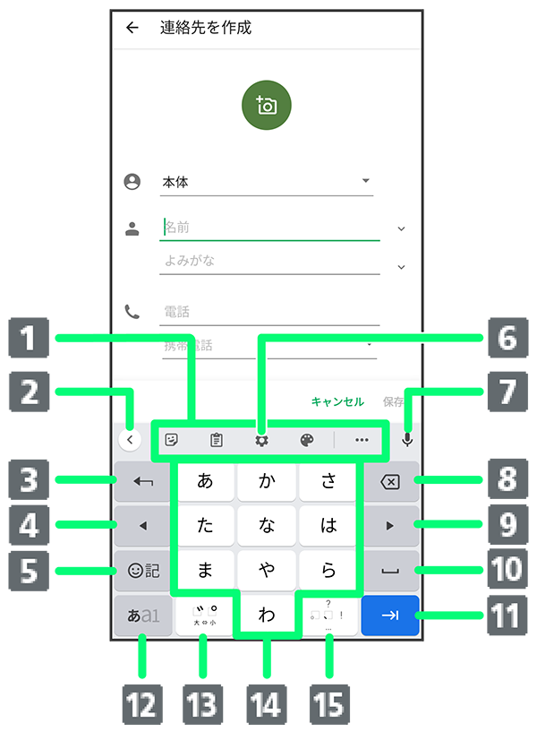 - 文字入力モードを切り替えます(ひらがな/英字/数字)。2