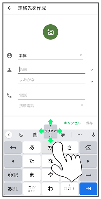 12キーで入力するとき、キーを上下左右にフリックすることで、キーを繰り返しタップすることなく、入力したい文字を入力できます。キーに触れると、フリック入力で入力できる候補が表示されます。入力したい文字が表示されている方向にフリックすると、文字が入力されます。