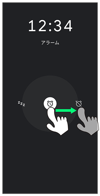 へドラッグするとスヌーズが設定されます。- スリープ中でないとき、またはスタート画面を表示していないときは、ポップアップでアラーム通知画面が表示されます。アラームを止めるときは、スヌーズを利用する場合はをタップします。