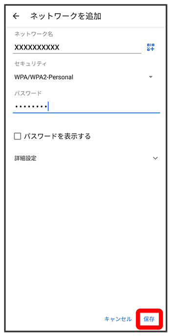 - 非公開ネットワークのアクセスポイントのときは、をタップして、「非公開ネットワーク」をに変更してからをタップしてください。