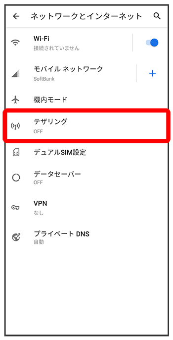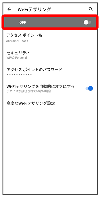 テザリング画面でアクセスポイント名を入力セキュリティタイプを選択パスワードを入力