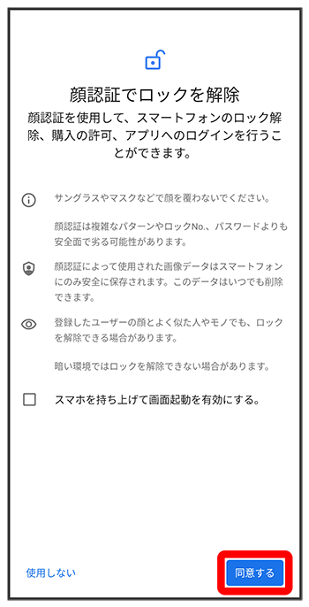 顔データを登録すると、画面点灯時に自動的に顔認証され、ロックが解除されます。
