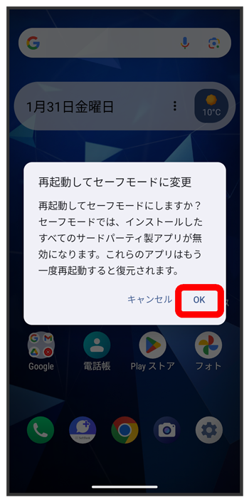 - セーフモードで電源を入れると、追加していたウィジェットが削除されることがあります。