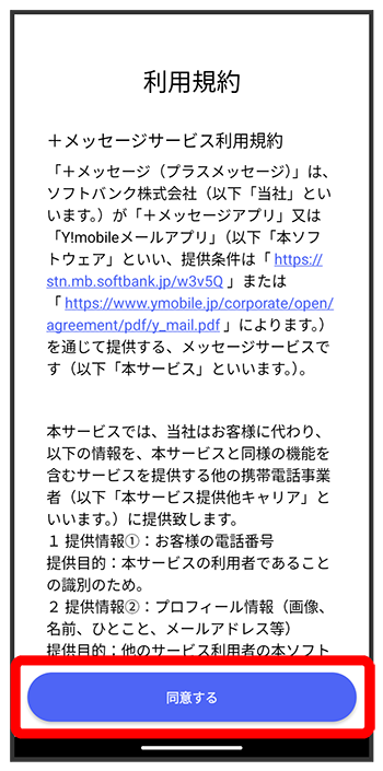 - 他のメールアプリをデフォルトのSMSアプリとして設定している場合は、+メッセージをデフォルトのSMSアプリに設定する画面が表示されます。画面の指示に従って+メッセージをデフォルトのSMSアプリに設定してください。
