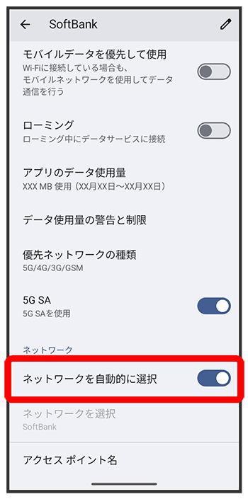 - 自動的に適切な通信事業者に接続する場合は、をONにします(