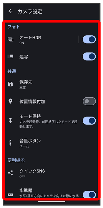 | 詳細設定 | ・オートHDR 逆光などコントラストが強いシーンで、白とびや黒つぶれを軽減して撮ることができます。 ・連写 ・手振れ補正 手振れ補正をするかどうかを設定します。 ・録画フォーマット 動画の録画フォーマットを設定します。 ・録音方式 動画の録音方式を設定します。 ・ミュート 動画録画中に音声を録音するかどうかを設定します。 ・風切り音低減 動画録画中に風切り音を低減するかどうかを設定します。 ・録画中割り込み防止 動画録画中に、割り込み通知による音とバイブレーションの鳴動を止めるかどうかを設定します。 ・保存先 保存先を設定します。 ・位置情報付加 撮ったすべての写真/動画に、位置情報を付加するかどうかを設定します。 ・モード保持 カメラ起動時に前回終了したモードで起動するかどうかを設定します。 ・音量ボタン 撮影画面で音量大/小キーを押したときの動作を設定します。 ・クイックSNS 撮影画面で上にフリックすると、設定したアプリで最後に撮った写真や動画を利用できます。 ・水準器 水準器を表示するかどうかを設定します。 ・撮影補助ライン 撮影補助ラインを表示するかどうかを設定します。 ・QRコード読み取り QRコードを読み取るかどうかを設定します。 ・テーマ選択 カメラ起動画面のテーマを設定します。 ・カメラ機能ガイド 風切り音低減、操作ガイドを確認できます。 ・初期設定に戻す カメラの設定をお買い上げ時の状態に戻します。 |