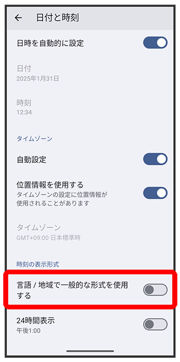 ユーザーの言語/地域の標準に従って24時間表示/12時間表示が自動設定されます。