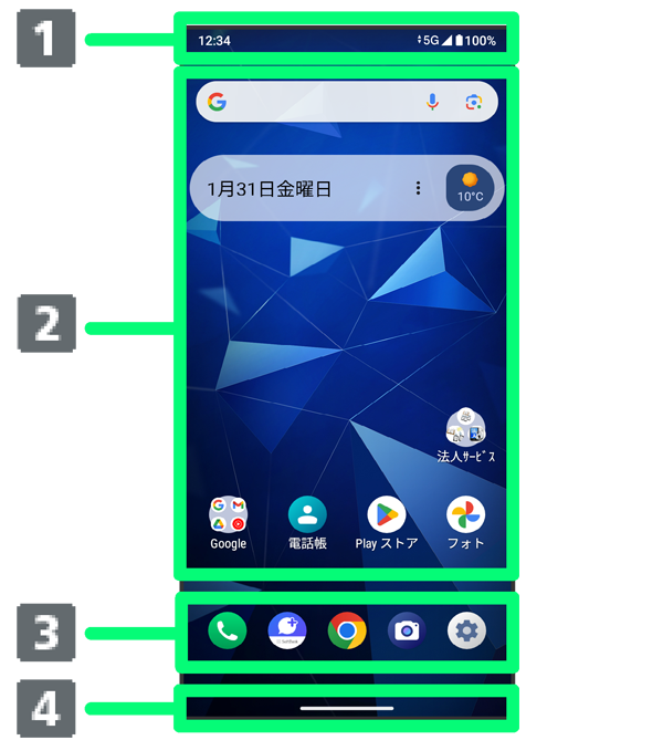 | 待受エリア | アプリのショートカットやフォルダ、ウィジェットを自由に配置できます。 |