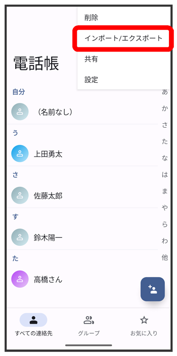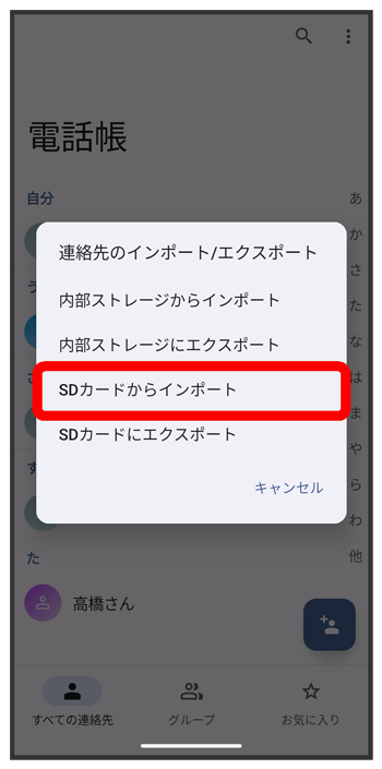 SDカードに保存(バックアップ)した電話帳データを読み込み(インポート)できます。