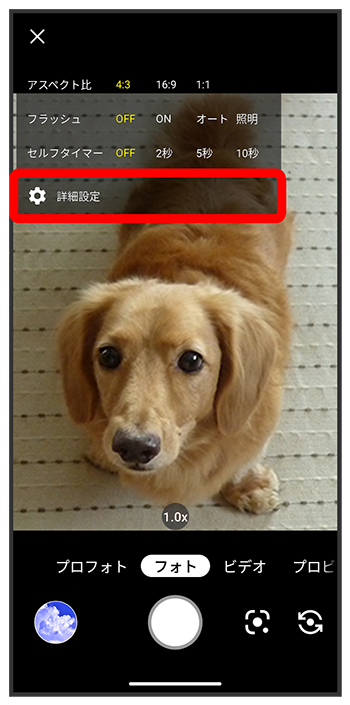 | 詳細設定 | ・オートHDR 逆光などコントラストが強いシーンで、白とびや黒つぶれを軽減して撮ることができます。 ・連写 ・手振れ補正 手振れ補正をするかどうかを設定します。 ・録画フォーマット 動画の録画フォーマットを設定します。 ・録音方式 動画の録音方式を設定します。 ・ミュート 動画録画中に音声を録音するかどうかを設定します。 ・風切り音低減 動画録画中に風切り音を低減するかどうかを設定します。 ・録画中割り込み防止 動画録画中に、割り込み通知による音とバイブレーションの鳴動を止めるかどうかを設定します。 ・保存先 保存先を設定します。 ・位置情報付加 撮ったすべての写真/動画に、位置情報を付加するかどうかを設定します。 ・モード保持 カメラ起動時に前回終了したモードで起動するかどうかを設定します。 ・音量ボタン 撮影画面で音量大/小キーを押したときの動作を設定します。 ・クイックSNS 撮影画面で上にフリックすると、設定したアプリで最後に撮った写真や動画を利用できます。 ・水準器 水準器を表示するかどうかを設定します。 ・撮影補助ライン 撮影補助ラインを表示するかどうかを設定します。 ・QRコード読み取り QRコードを読み取るかどうかを設定します。 ・テーマ選択 カメラ起動画面のテーマを設定します。 ・カメラ機能ガイド 風切り音低減、操作ガイドを確認できます。 ・初期設定に戻す カメラの設定をお買い上げ時の状態に戻します。 |