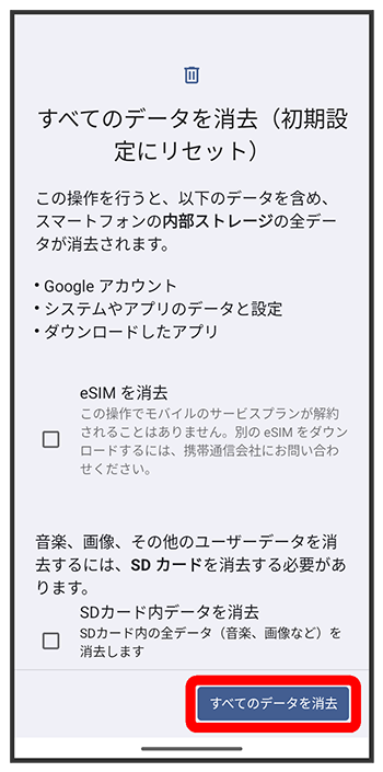 - eSIMを使用しているときは、にチェックを入れて次に進むと、現在利用しているeSIMが消去されますのでご注意ください。