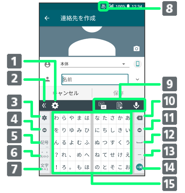 - 入力モードを切り替えます(ひらがな/半角英字/数字)。